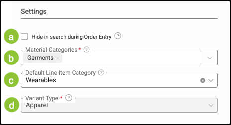 The Settings section includes options that control how a Material is organized and whether it can be selected during Order entry. These settings allow you to manage visibility in search, assign Material Categories, and designate a Default Line Item Category for consistent classification.