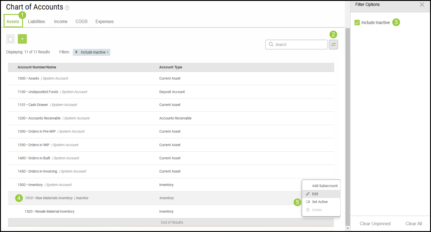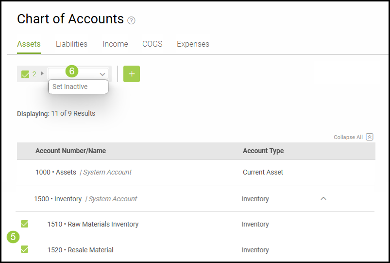 1. Navigate to Settings / Accounting / Chart of Accounts, click on the account type tab for the account to be set inactive.