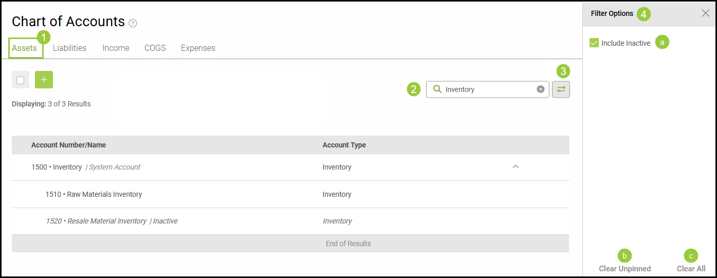 2. In the search box, enter a keyword to search. This will filter your chart of accounts for that account type.