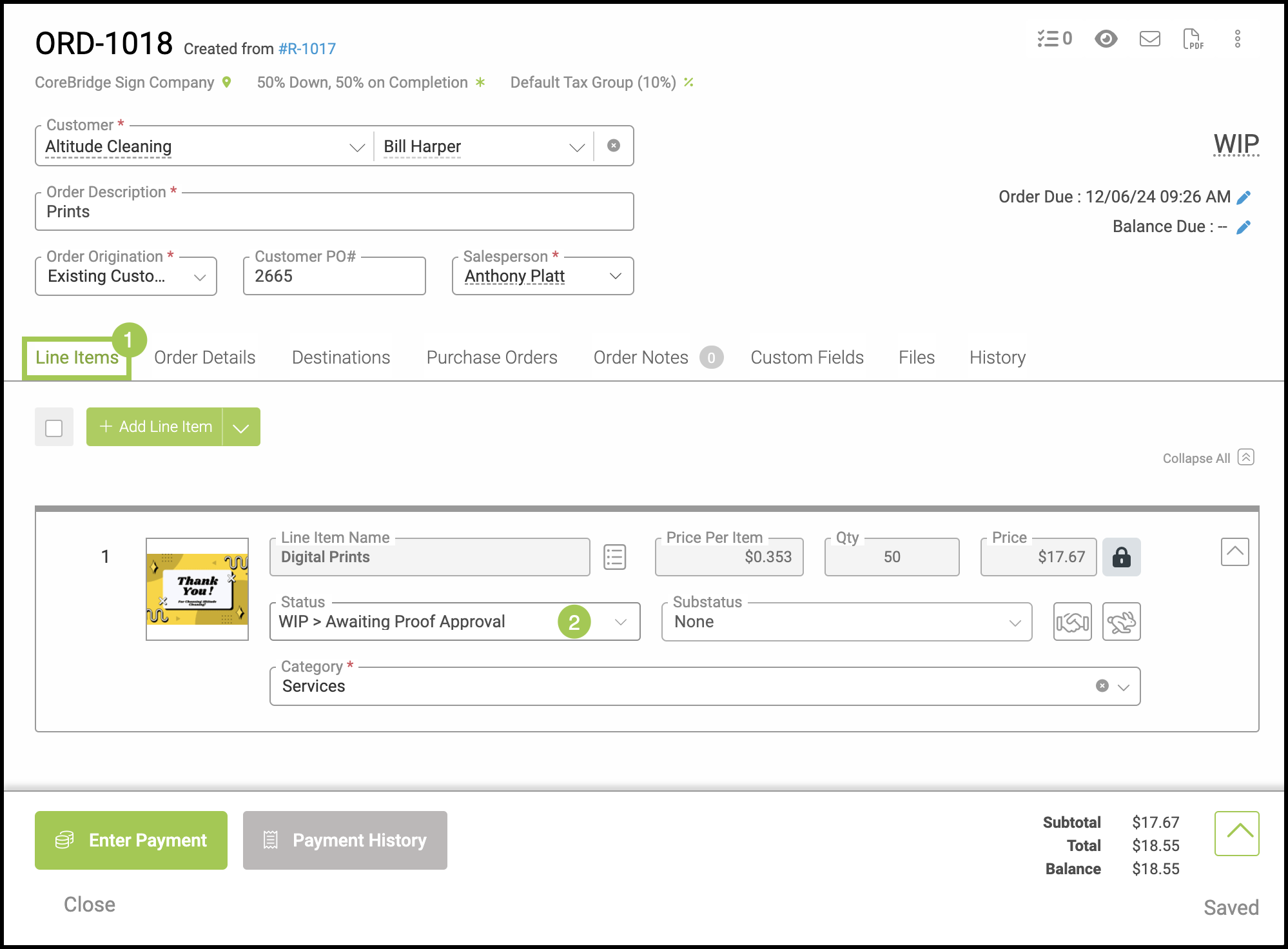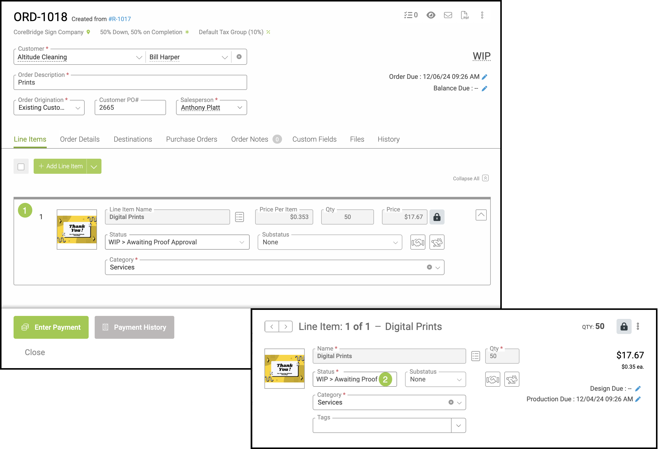 Note: The options that will be selectable in this dropdown are associated with the Line Item Statuses that have been created for Orders in the Pre-WIP and WIP tabs in Settings / Workflow / Line Item Statuses.