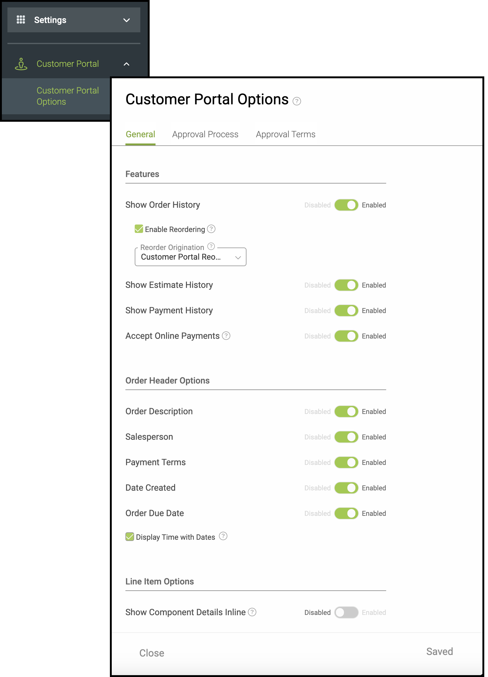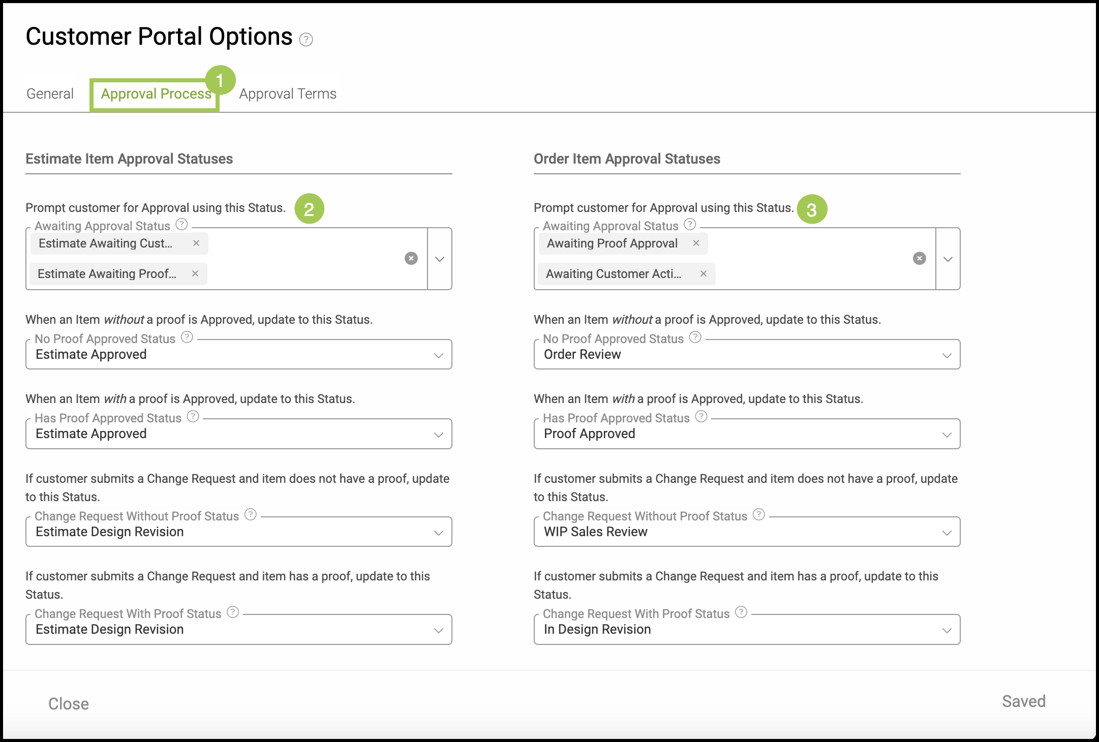 To select which Item Statuses will alert the customer and place their Order in the Action Required section of the Customer Portal, navigate to Settings / Customer Portal / Customer Portal Options / Approval Process. For more information on Settings and the Customer Portal, please see Customer Portal in Settings.