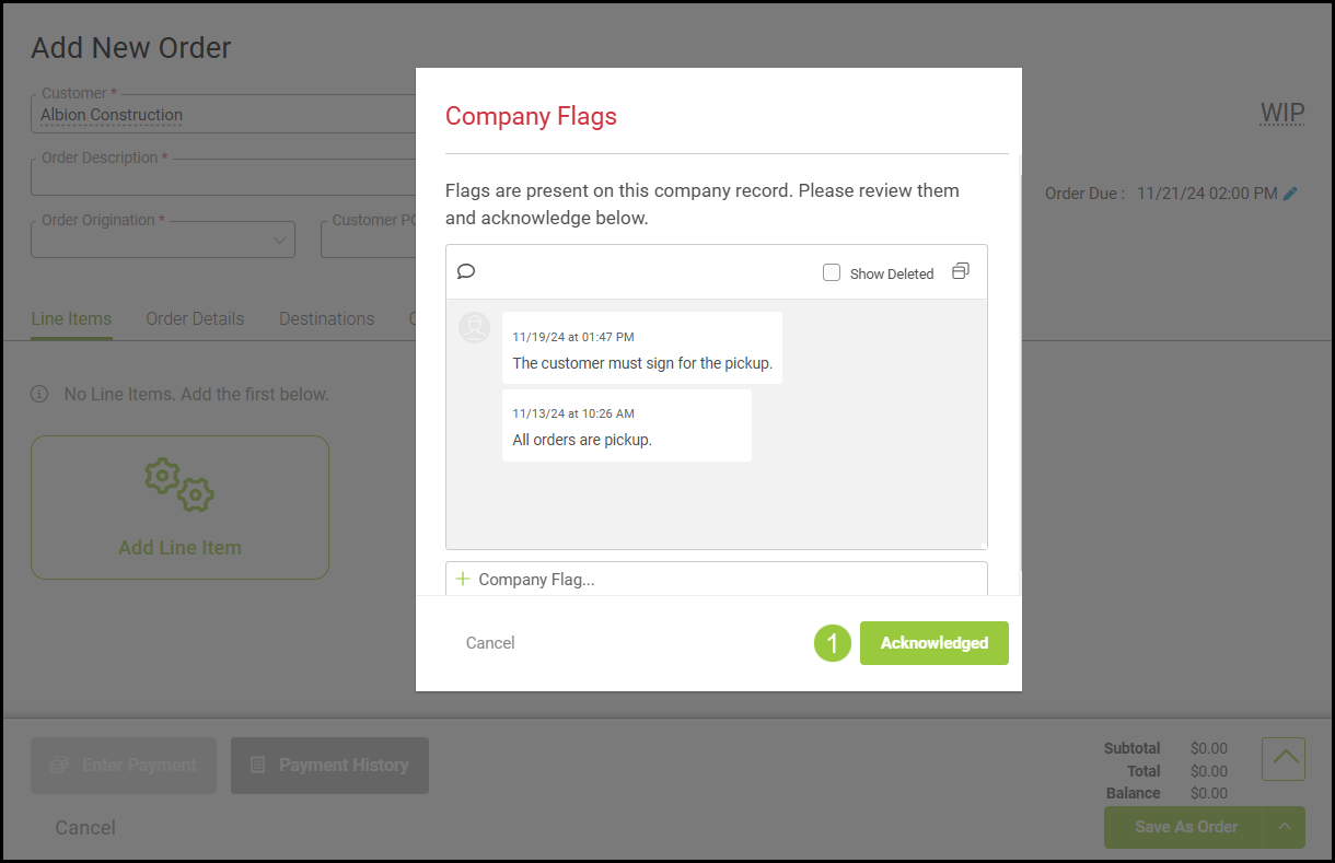 1. The Company Flag must be Acknowledged to proceed with creating the new order.