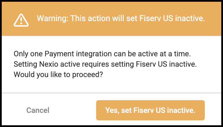 Note: You may only have one Payment Integration active at a time. If you currently have another in use, you will see a warning message alerting you to set the other to inactive in order to use Nexio.
