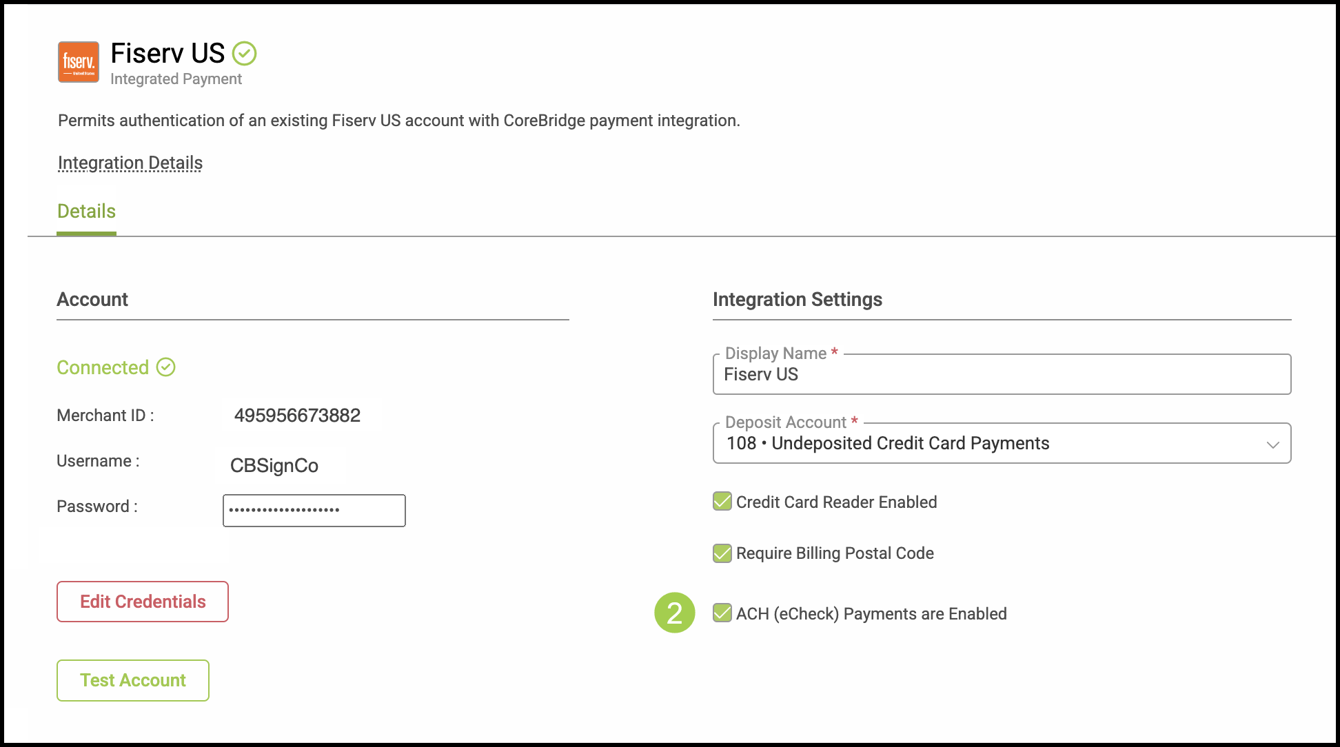* If currently integrated with Fiserv US, eCheck is an optional add-on to the standard merchant account. If you wish to add eCheck added to your account, complete the following form: CoreBridge | Fiserv US (Formerly Clover Connect). In the "Comments" box, include your current Fiserv US merchant ID #, noting that you are interested in eCheck.