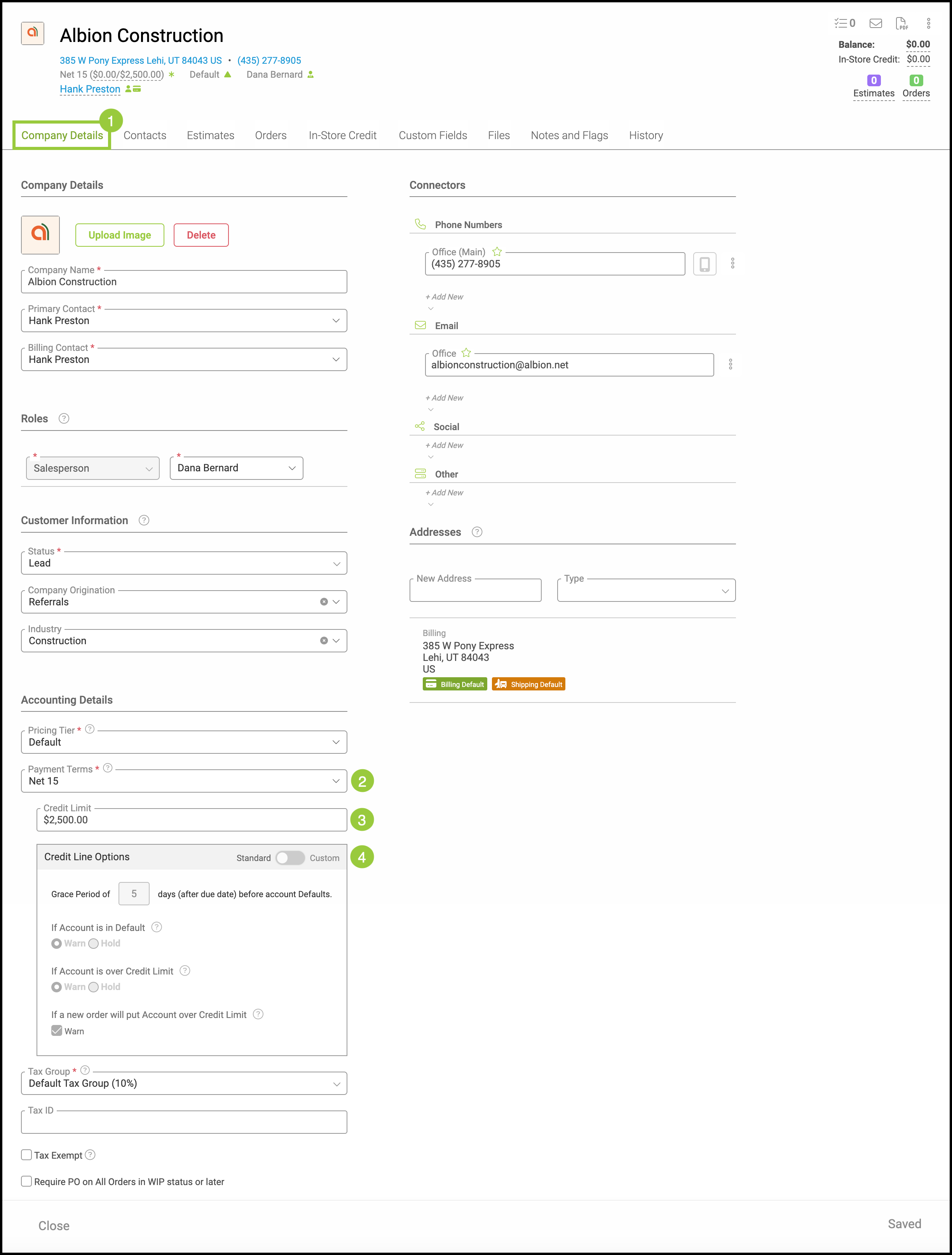 3. The Credit Limit will automatically populate to what was set as the default under Settings / Accounting / Credit Line Options. It can be customized in this section for each company.