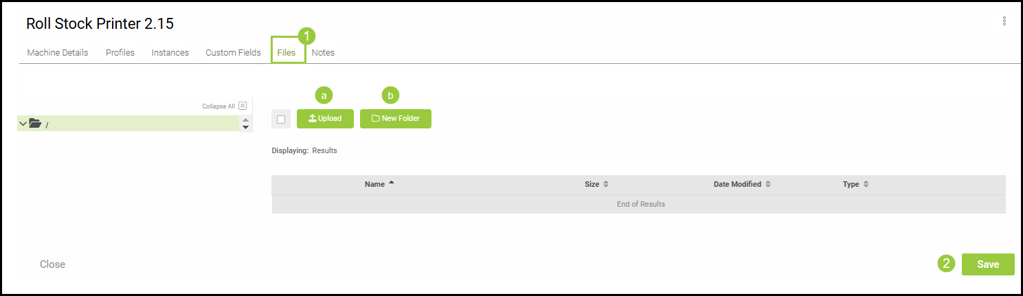 Files associated with this Machine can be added, organized, and stored here. Any changes made will need to be saved by clicking on the Save button at the bottom of the page.