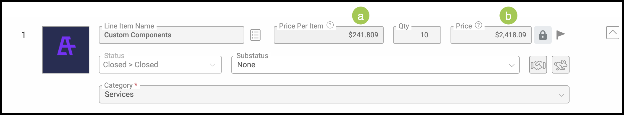 b. After being multiplied by the Quantity, the end calculation is displayed in the Price field on the Line Item as a total that has been rounded to 2 decimal places.