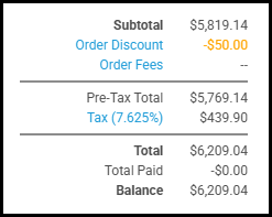 Example: An order with a Pre-Tax Total of $5,769.14 multiplied by a tax group rate of 7.625% would equal a tax amount of $439.8969 ($5,769.14 x 0.07625 = $439.896925).