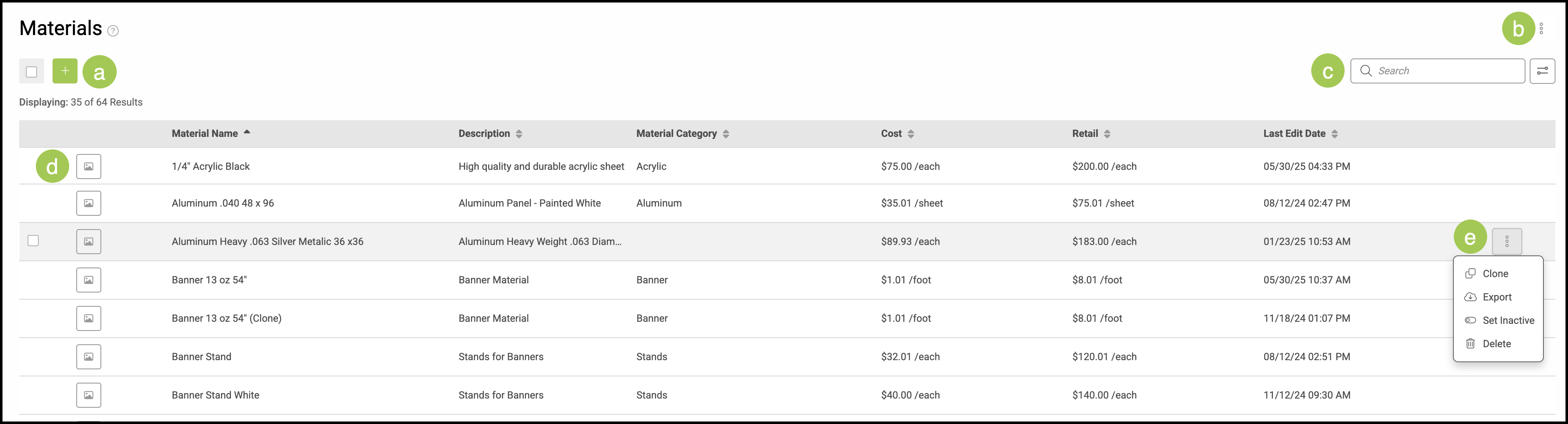 b. The dropdown menu gives you the options to Clone, Export, Set Inactive, or Delete the Material selected.