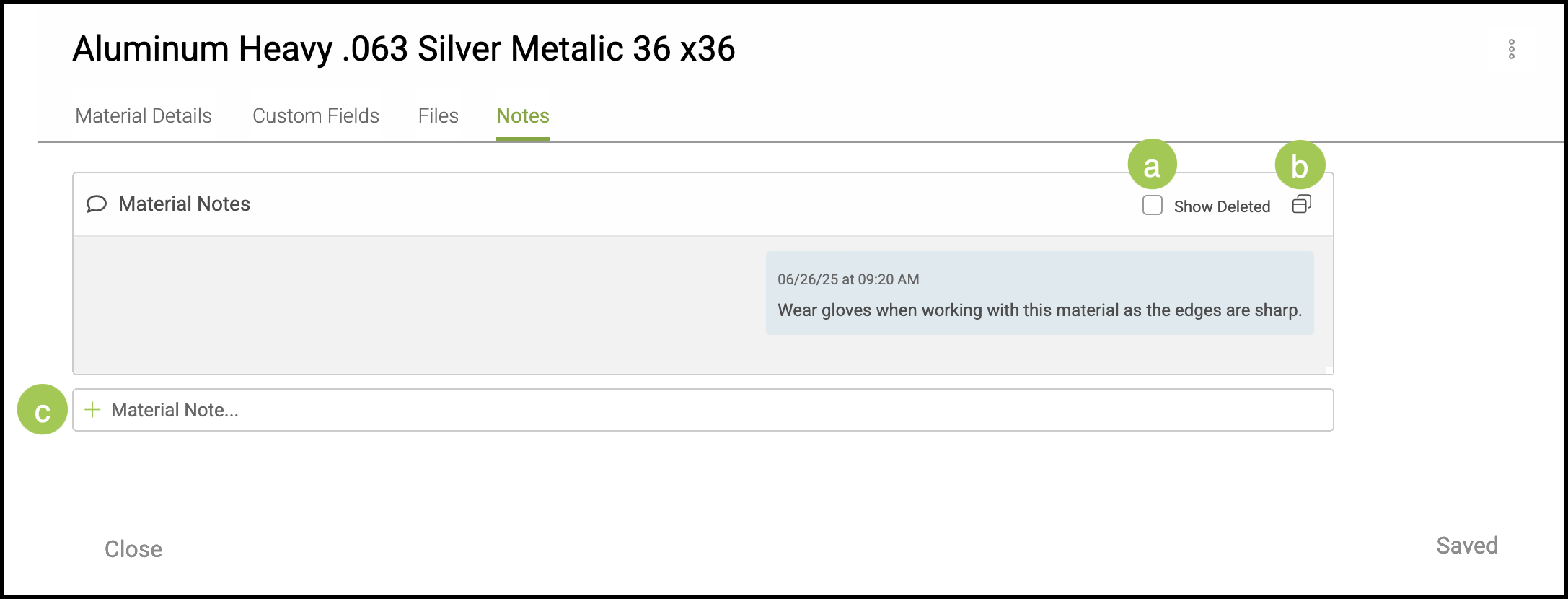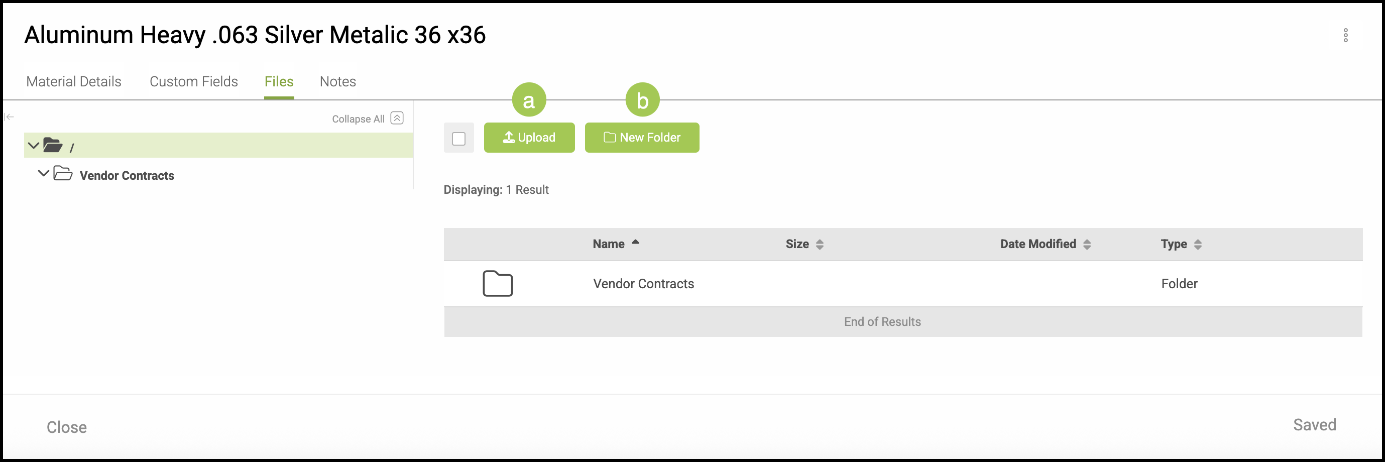 The Files tab offers a way to organize and store important documents related to this Material such as vendor contracts, purchase history, or safety data sheets.