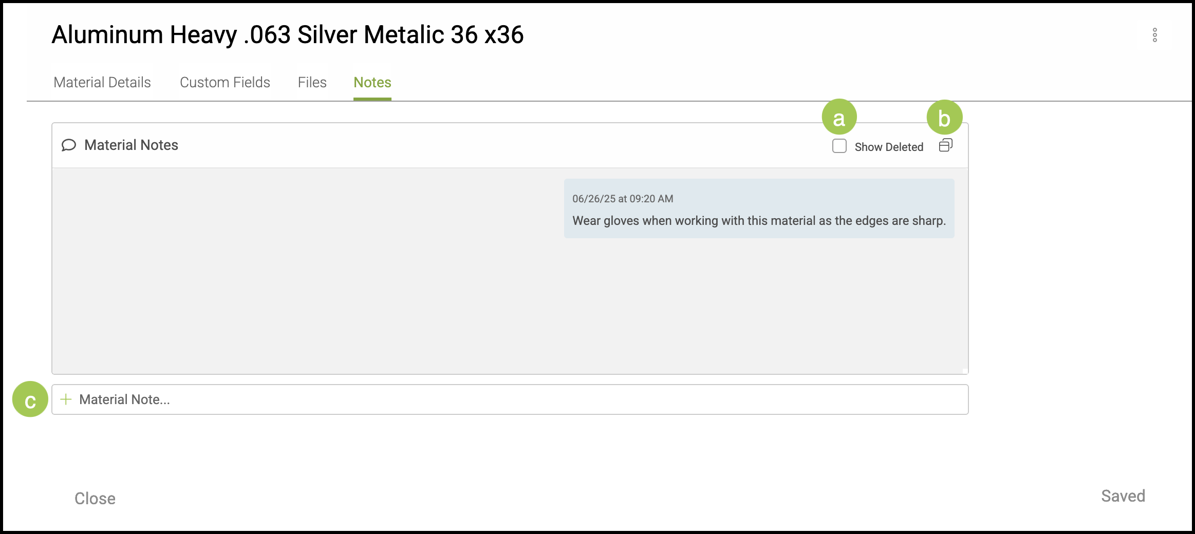 c. This field allows you to add a new note on the Material.
