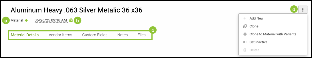 With the Material Details tab selected on the top of the Materials Screen, you will be able to access basic information about this Material and edit as necessary.