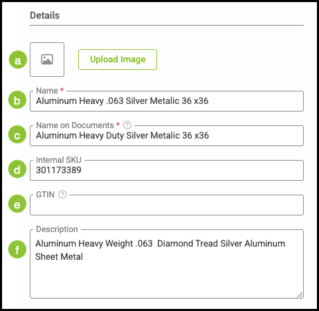 b. Name - This is the Part name. It is recommended to begin with the Material type, followed by key attributes such as thickness, color, or size, since this name will appear in your Material list.