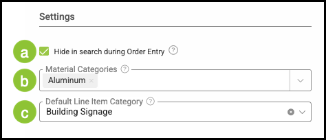 The Settings section includes options that control how a Material is organized and whether it can be selected during Order entry. These settings allow you to manage visibility in search, assign Material Categories, and designate a Default Line Item Category for consistent classification.