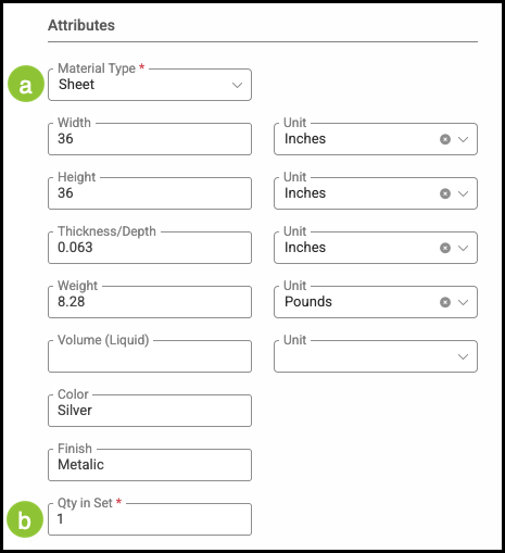 Attributes define the physical characteristics and specifications of a Material. These properties help ensure accurate quoting, production, and inventory management. While Material Type and Quantity in Set are the only required fields, it is recommended to complete as many fields as possible.