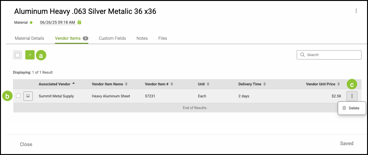 a. New Vendor Items can be added by clicking the Green Plus button.