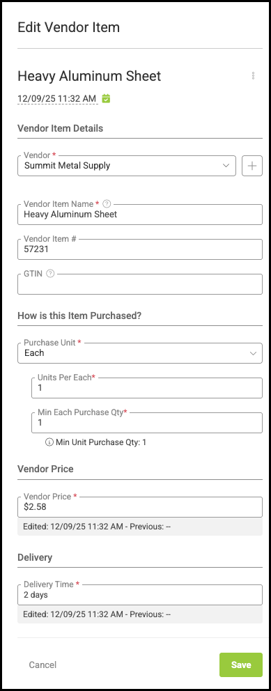A Vendor Item is a Vendor-specific version of a Material. Each Material can have multiple Vendor Items, allowing you to track variations such as Vendor part numbers, sizes, or packaging. This gives you a way to manage differences provided by each Vendor within a standalone Material without creating full Variants.