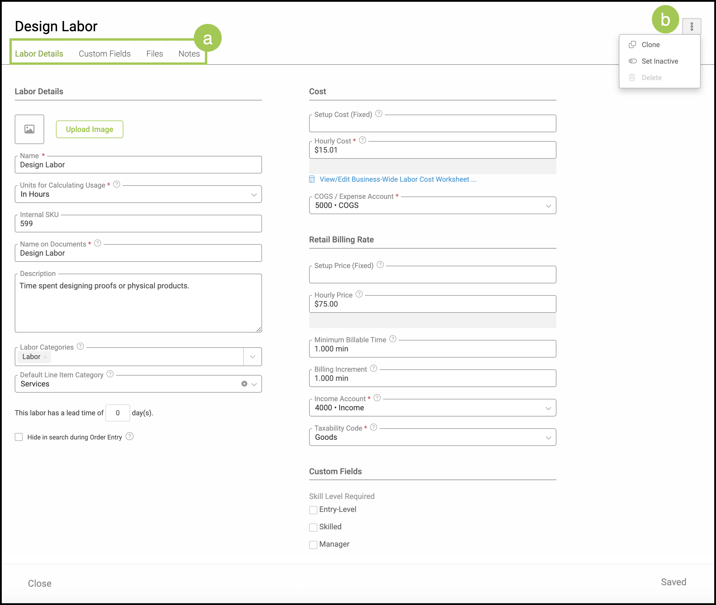 Note: Labors that are currently being used in active Orders can be set to Inactive, not Deleted.