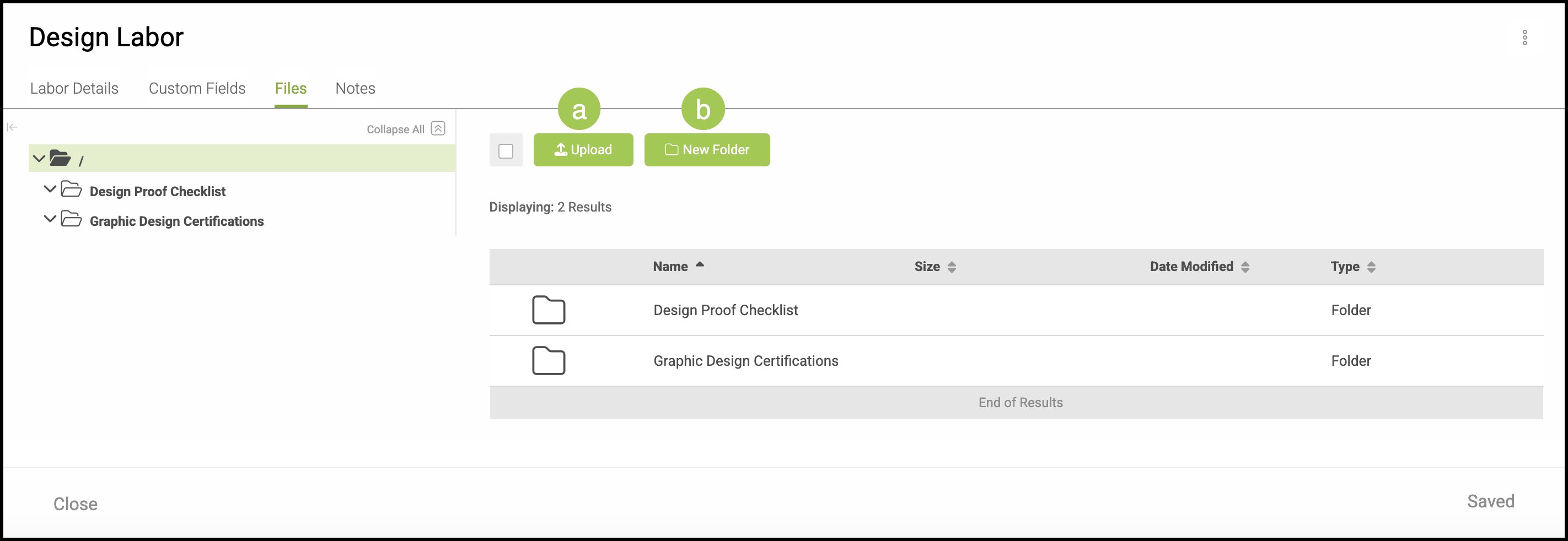 The Files tab offers a way to organize and store important documents related to this Labor such as training guides, certifications, images, or proofs.