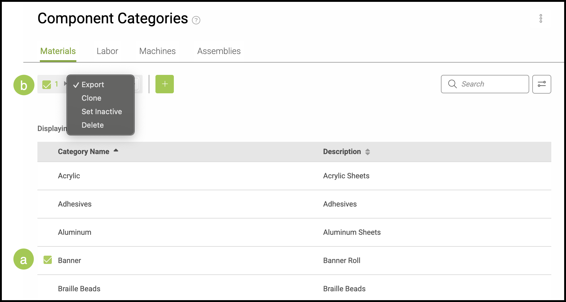 b. The dropdown menu gives you the options to Clone, Export, Set Inactive, or Delete the Component Category selected.