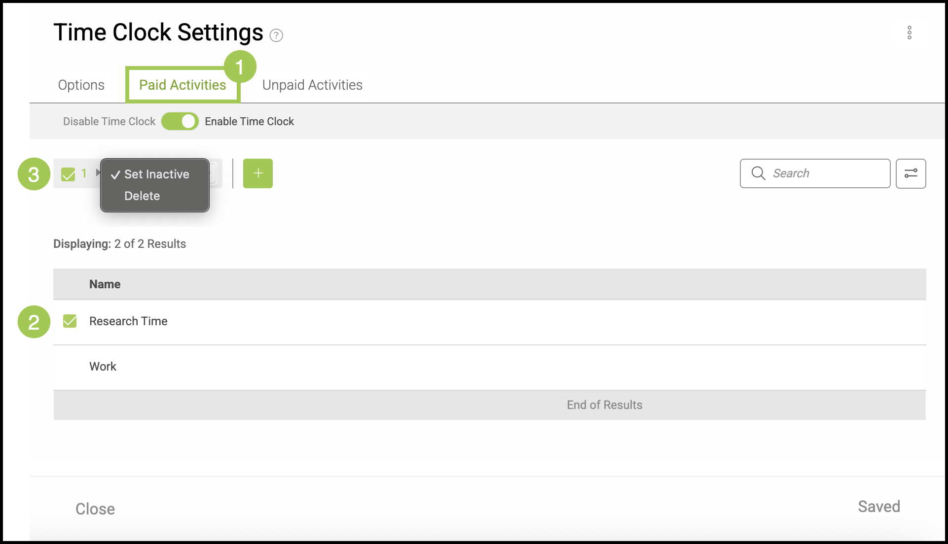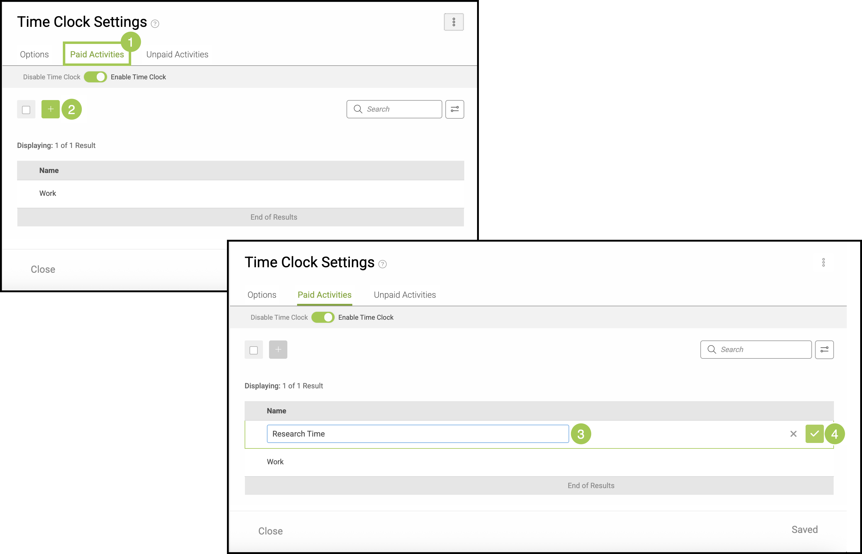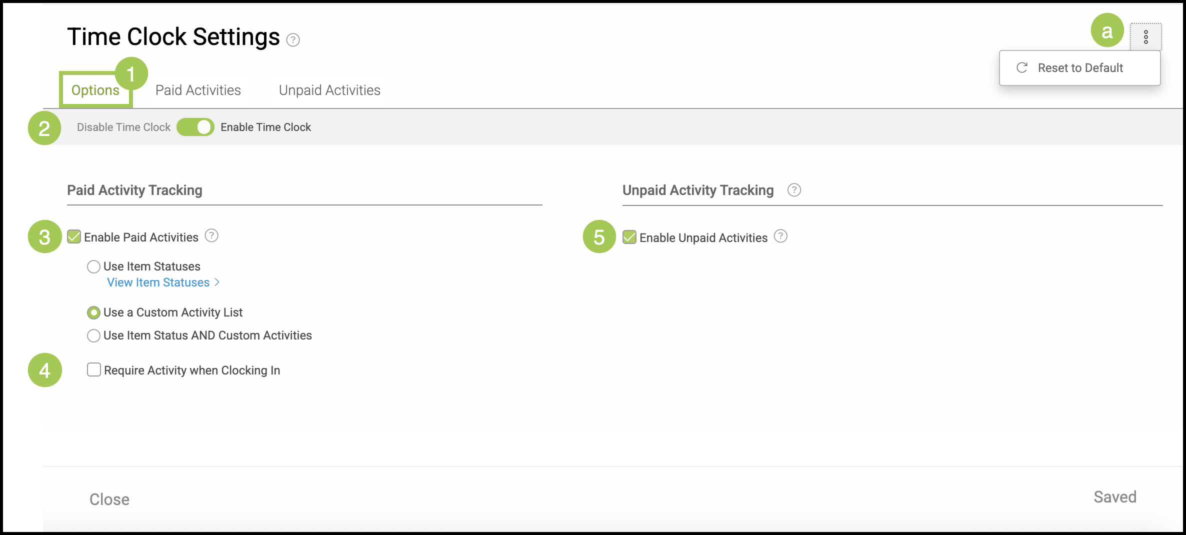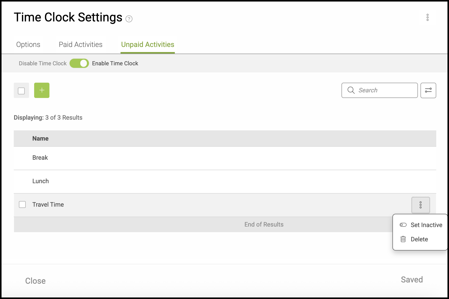 5. Enabling Unpaid Activities will allow users to select unpaid activities using the Time Clock functionality. These activities can include things like breaks or lunch and can be created in the Unpaid Activities tab.