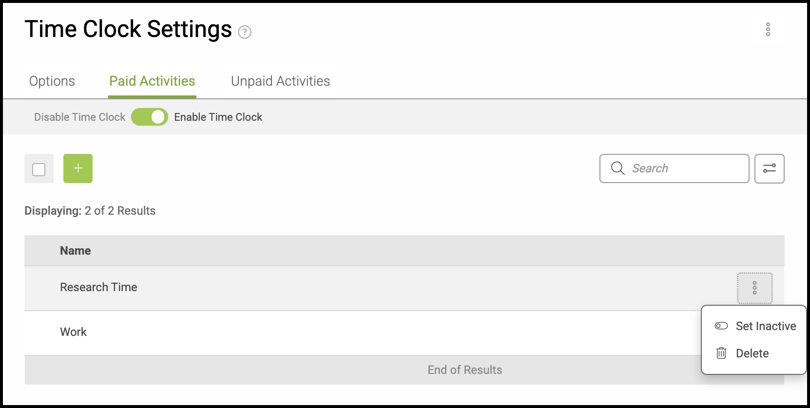 The Paid Activities tab allows you to review, add, and manage the list of activities employees can select when logging their time.