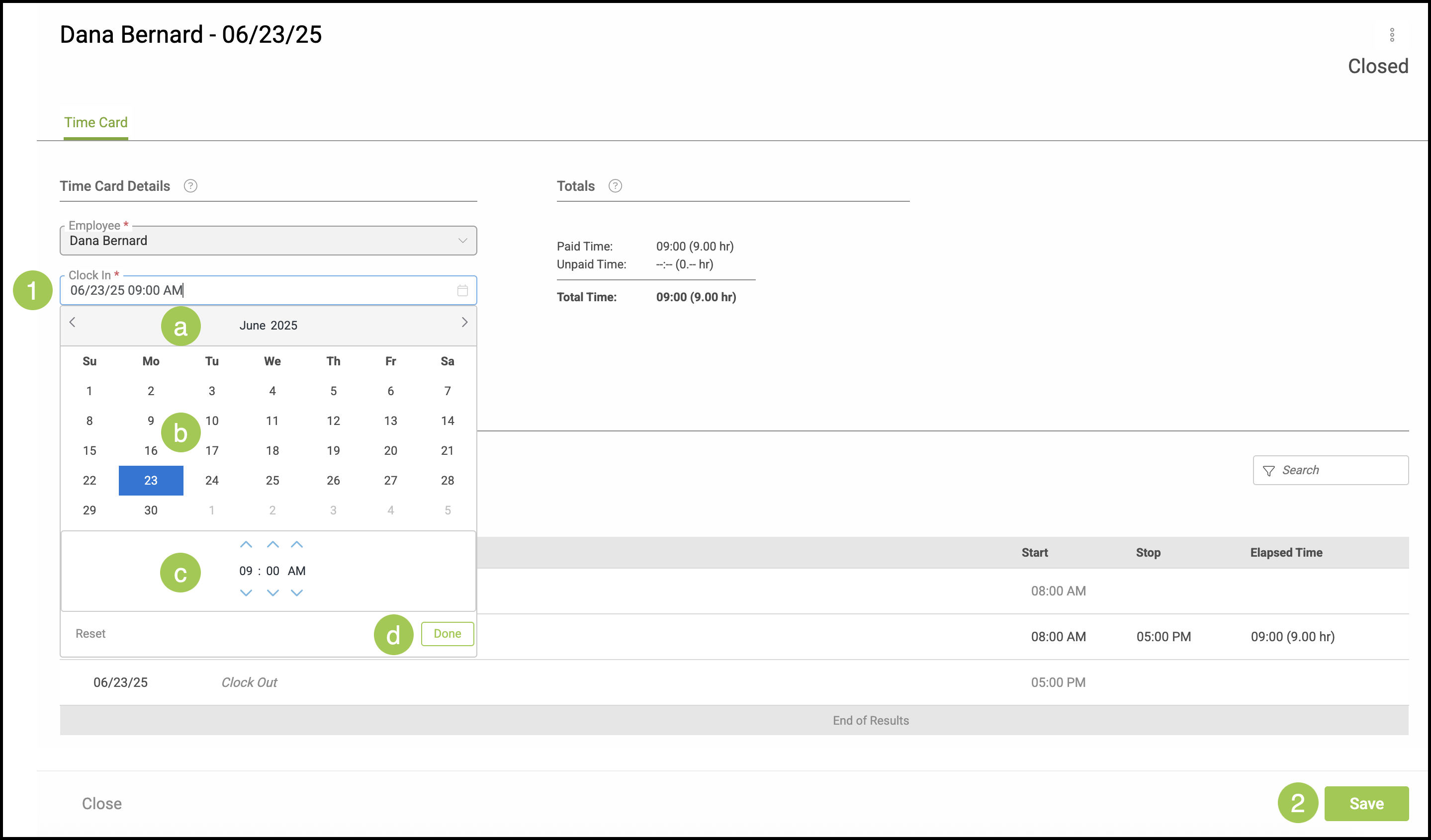 b. To adjust Clock In or Clock Out times, use the dropdown menus shown here.