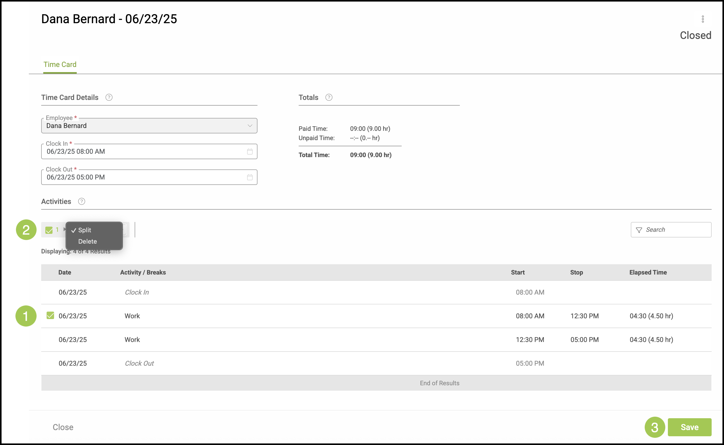 After selecting a specific time entry, you have the option to split the Activity listed on the time card.
