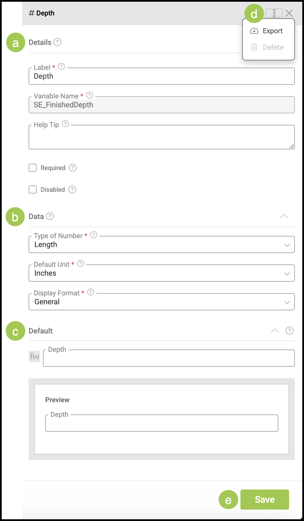 a. This dropdown allows you to select the type of Element you would like to add. You can choose an Input like Number, Checkbox, Dropdown. Or, select a Label option of Single-Line, Multi-Line, or Web Link.