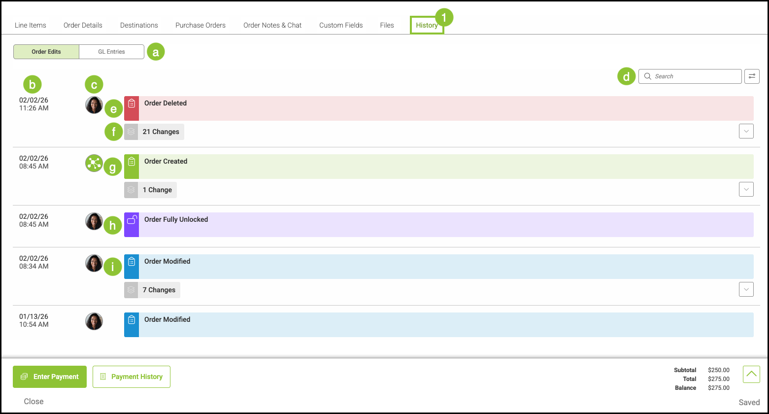 a. Order History is sectioned into two categories: Order Edits, which are basic changes to the order, and GL Entries, which are financial changes.
