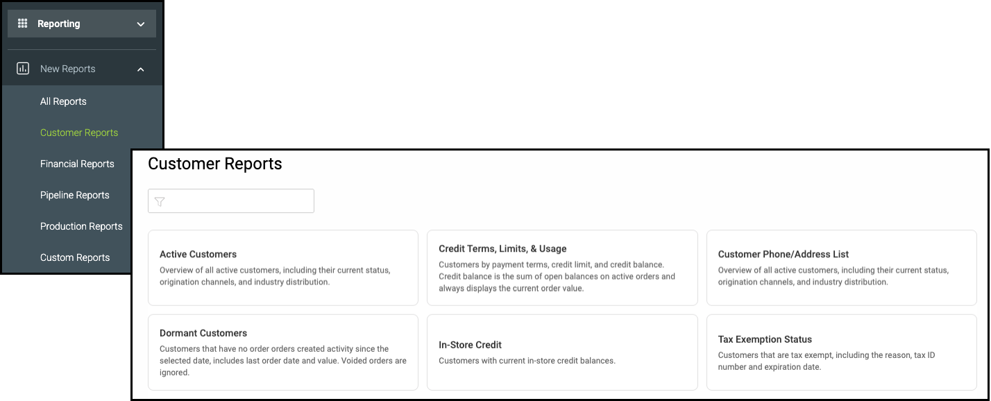 The New Reports Module includes several categories that give you focused insight into different parts of your business. These categories - Customer Reports, Financial Reports, Pipeline Reports, and Production Reports - help you analyze activity, review performance, and understand trends across your workflow.
