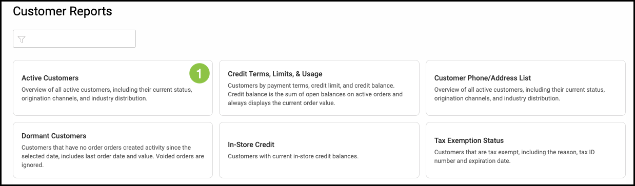 Note: Reports all function in the same way. This article will use Active Customers as the example.