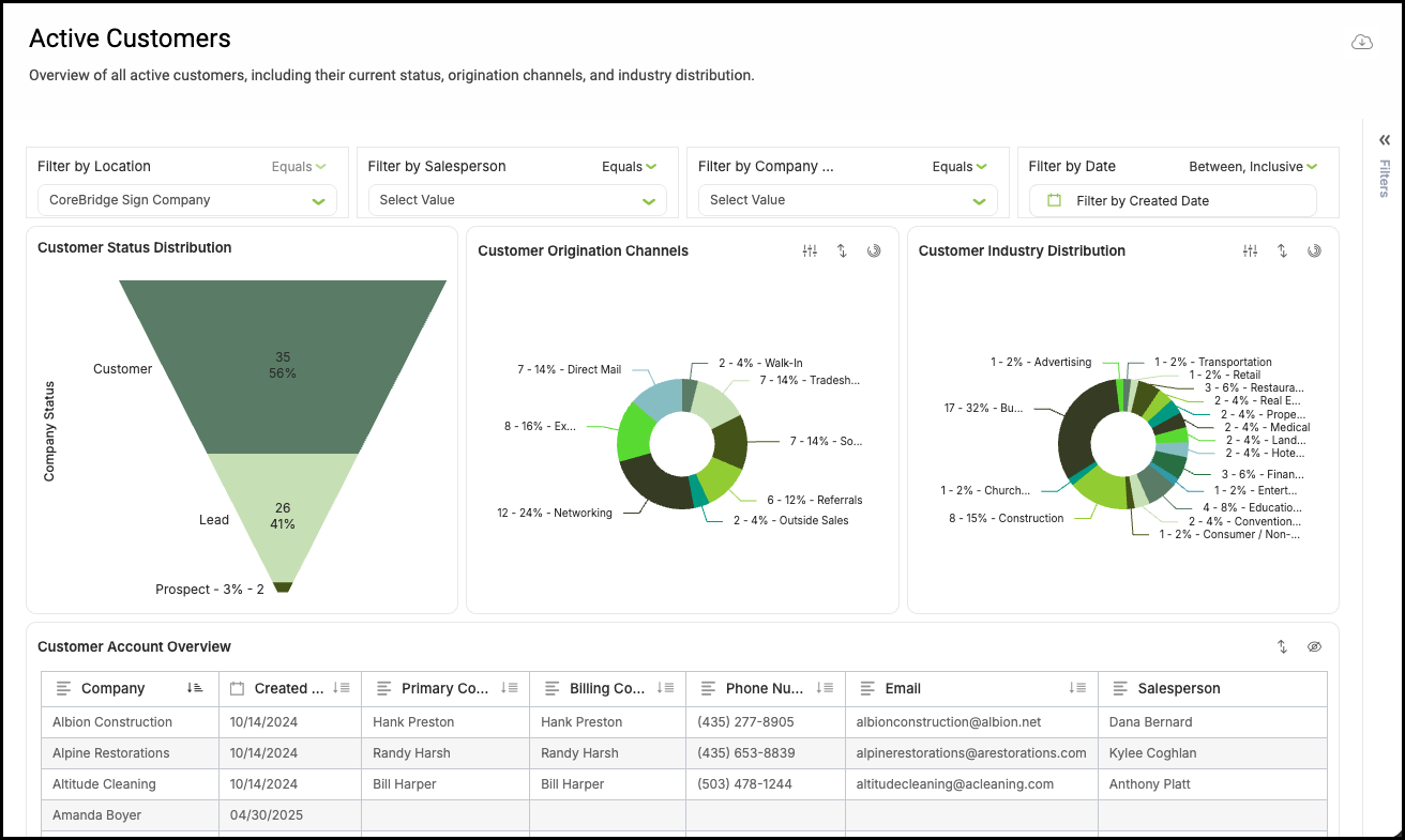 a. Active Customers - Overview of all active customers, including their current status, origination channels, and industry distribution.