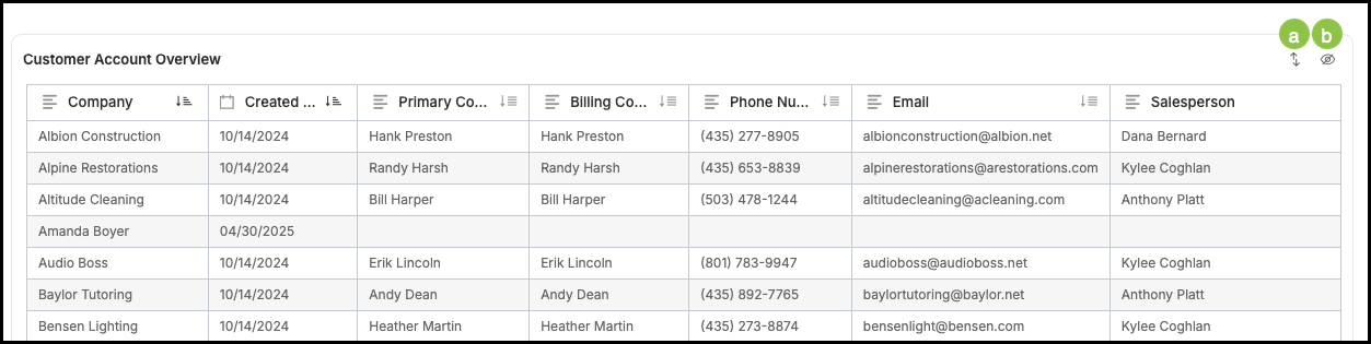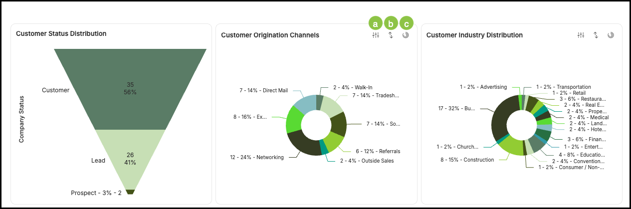 c. Customer Phone/Address List - Overview of all active customers, including their current status, origination channels, and industry distribution.