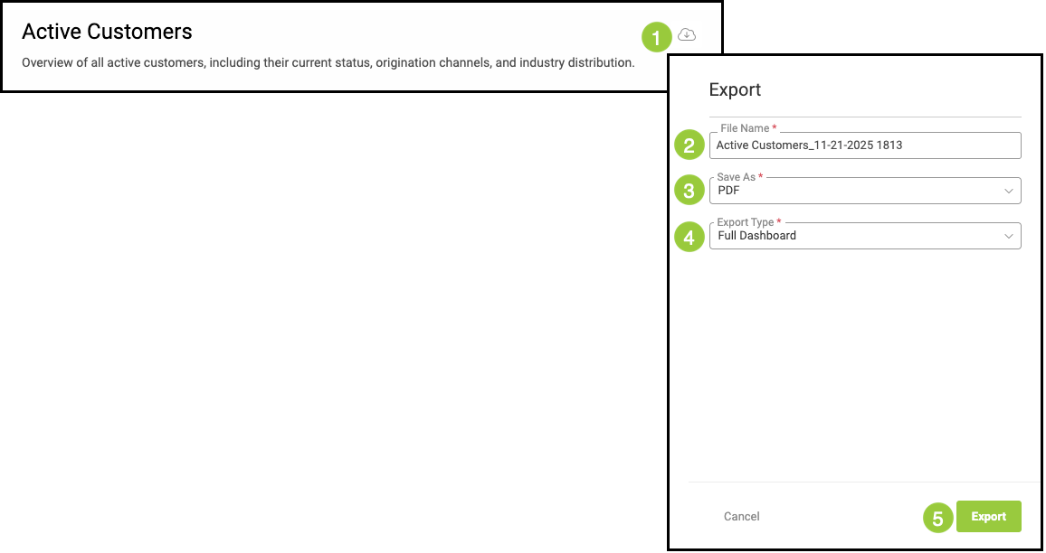 Exporting gives you a quick way to save or share the information you see on your screen. You can download a PDF version of the report, which captures the current view just like a screenshot. For the most complete set of data, simply open the full report before exporting to ensure all details are included in your export.