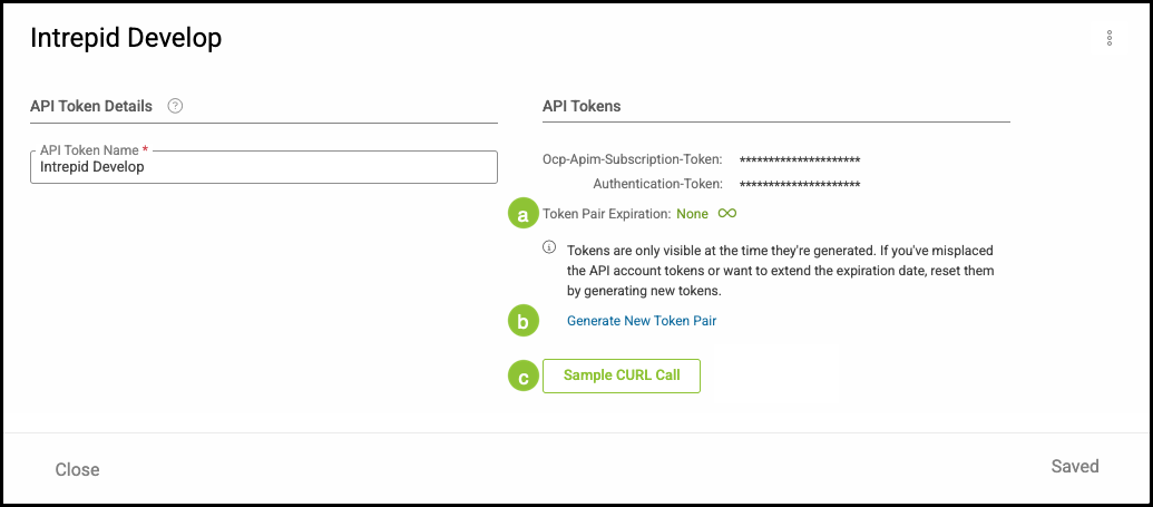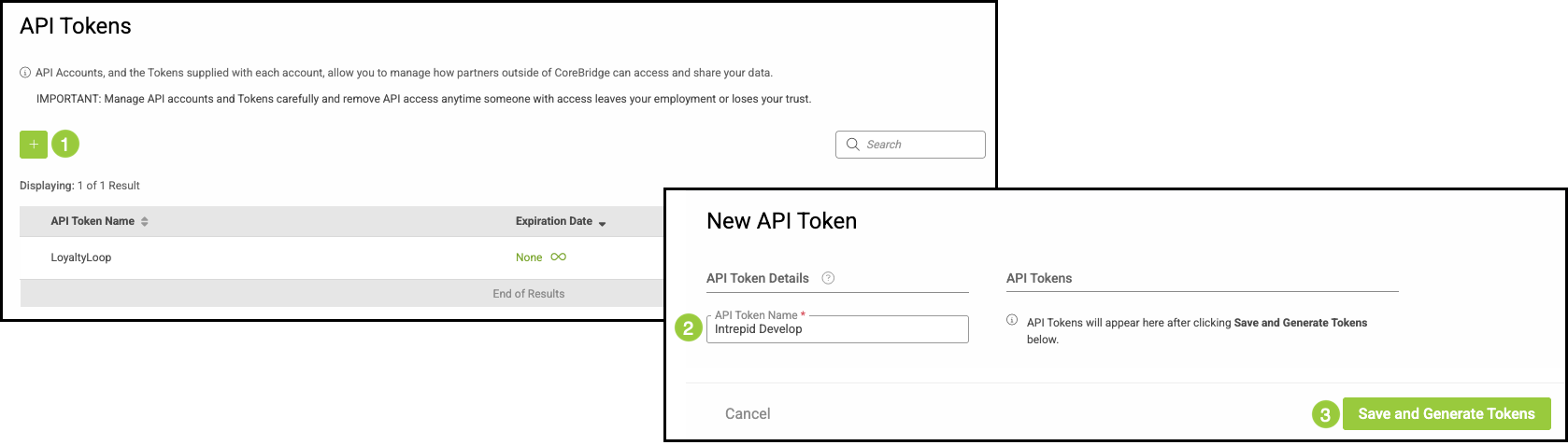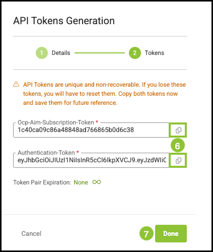 - Tokens are shown only once during creation and cannot be viewed again after you select Done. Be sure to copy and save them immediately. If a Token is misplaced or not recorded, new ones will need to be generated.
