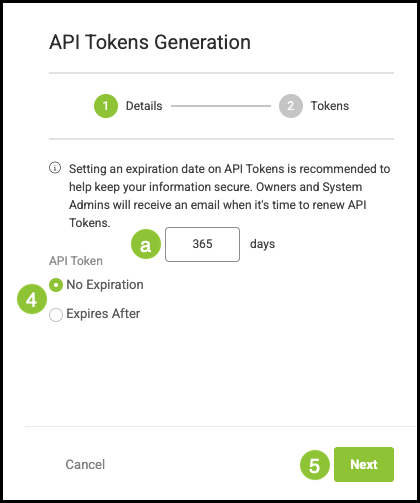 Note: If you plan to use API on an ongoing basis, selecting No Expiration is recommended to avoid disruptions.