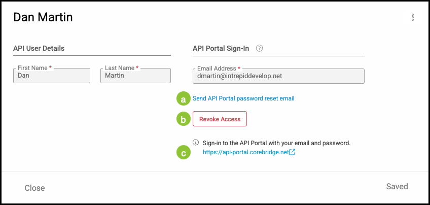 Note: API Users function as external access points that allow approved partners or applications outside of CoreBridge to retrieve or share specific data through the login you provide. Because these accounts are not standard Users and have direct access to portions of your data, we recommend managing them carefully and removing API access anytime an individual leaves your organization or no longer requires trusted access.