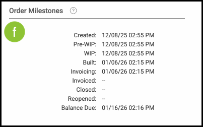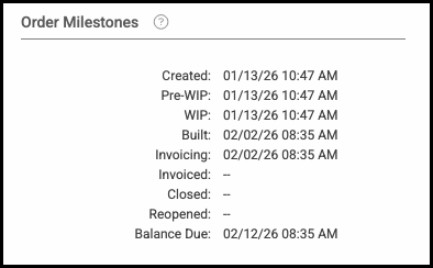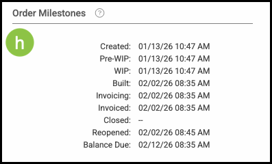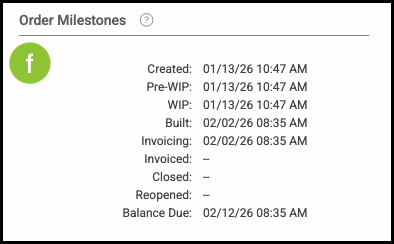 Example: The Invoiced and Reopened milestones are blank on this Order because those milestones have not been applied to the u1 version, even though they appear on the original Order.