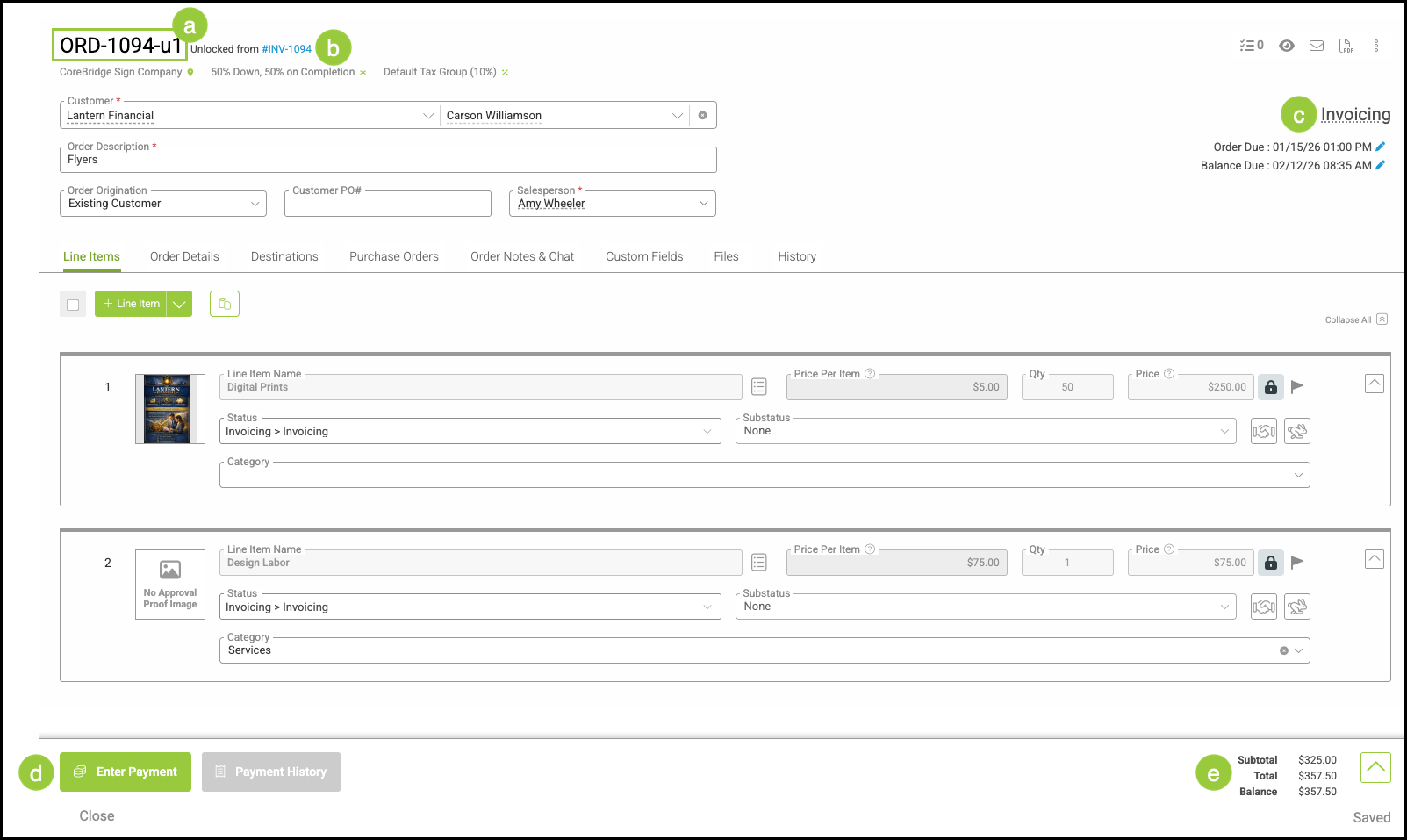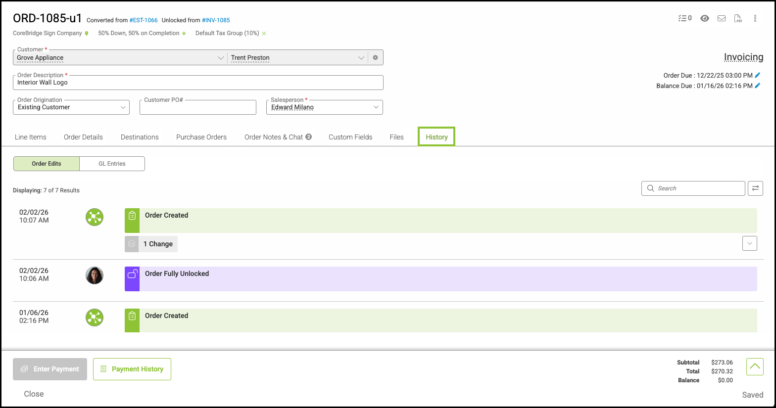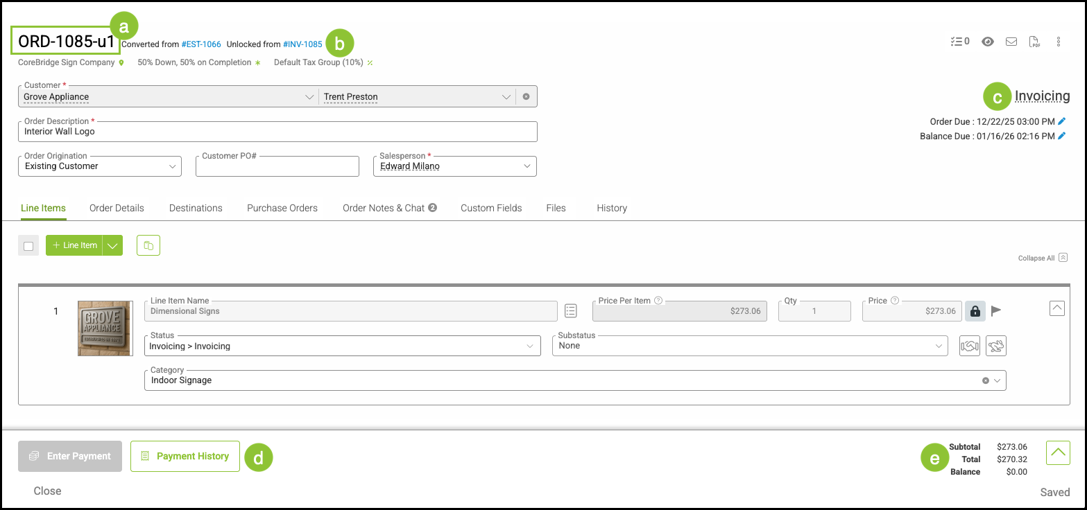 d. The Payment History button is available to view payments on this Order.