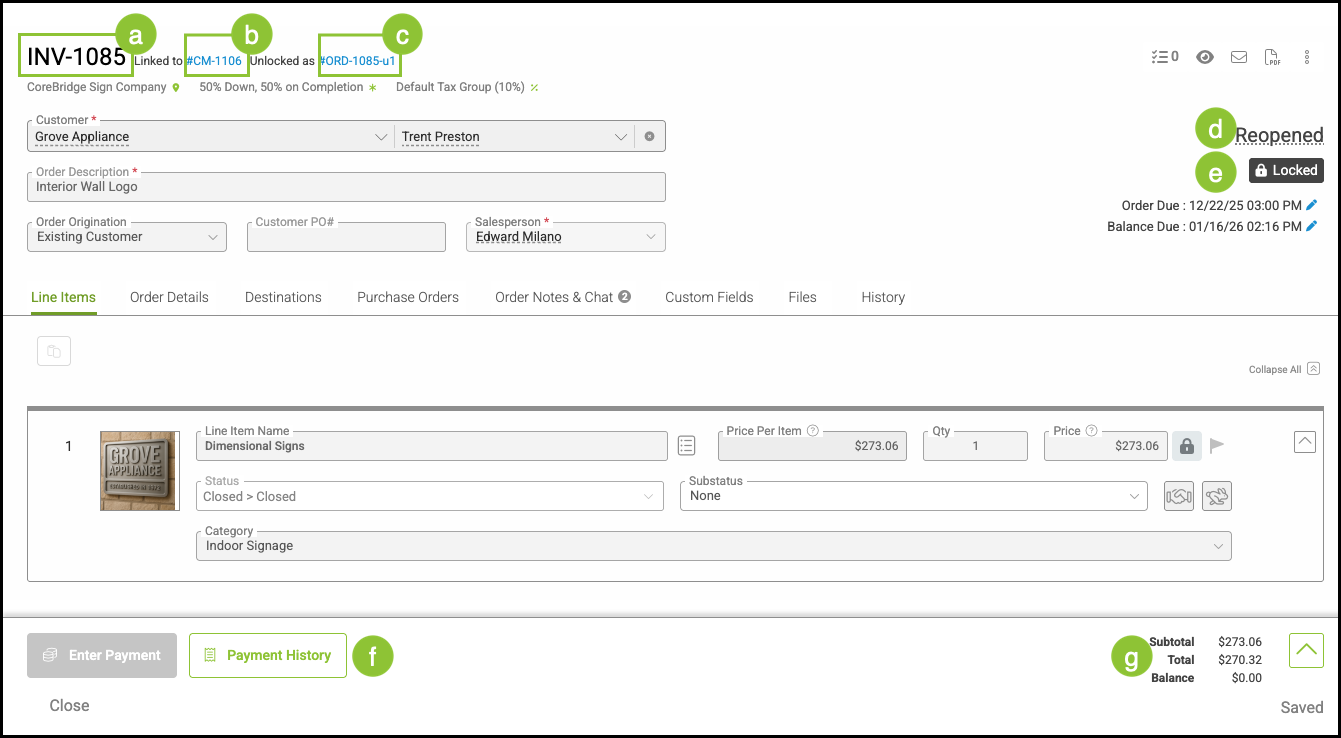 f. The Payment History button is available to view payments on this Order.