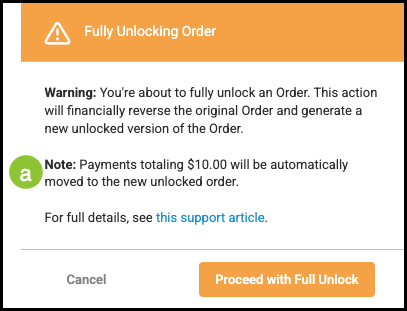 a. Any payments made, whether partial or in full, appear in this pop-up with the exact dollar amount that will be moved to the new, unlocked Order.