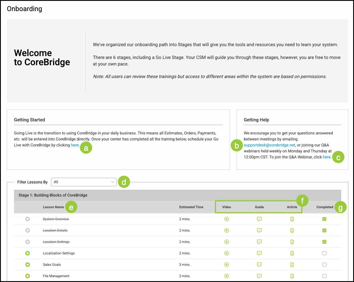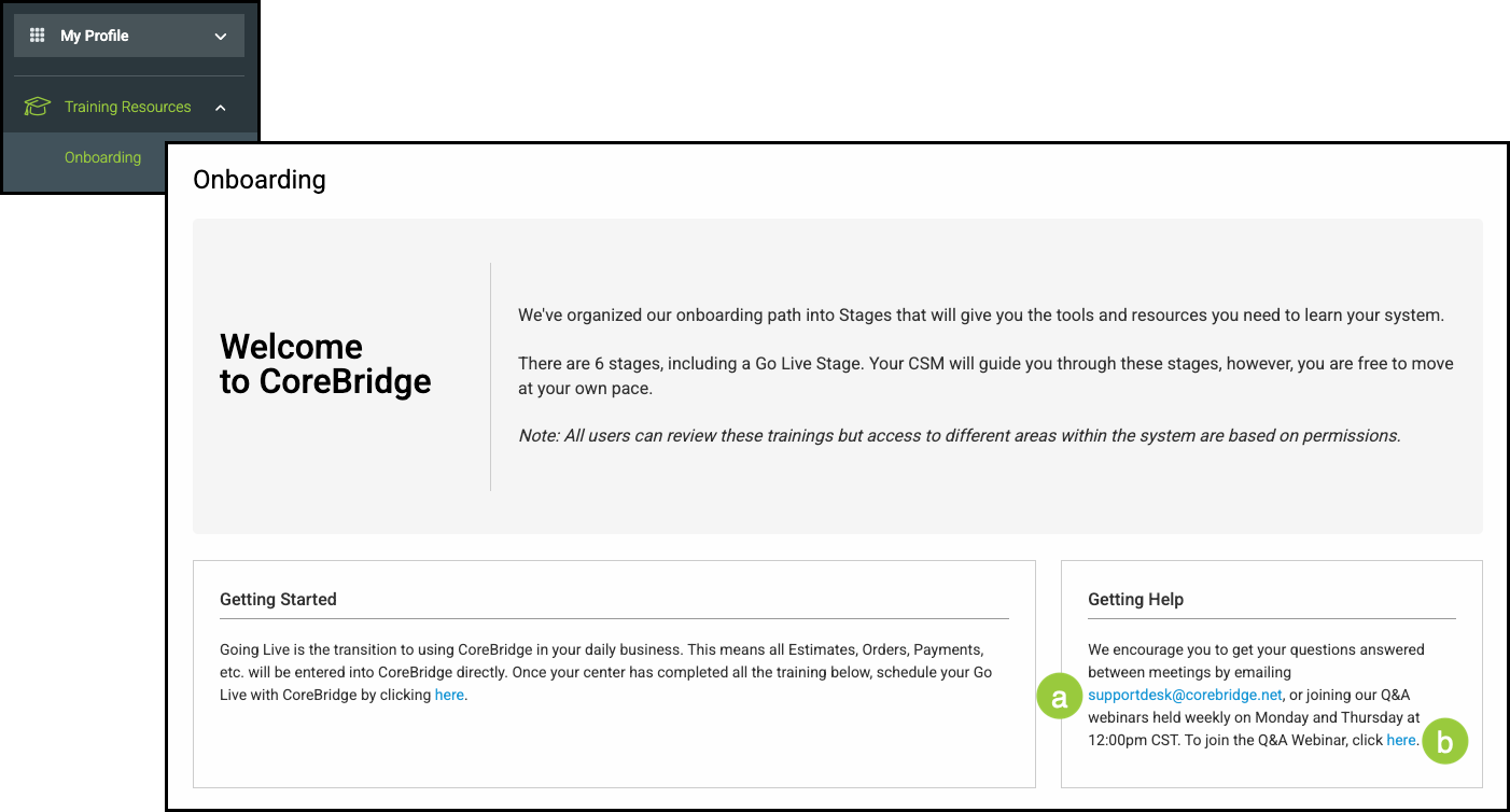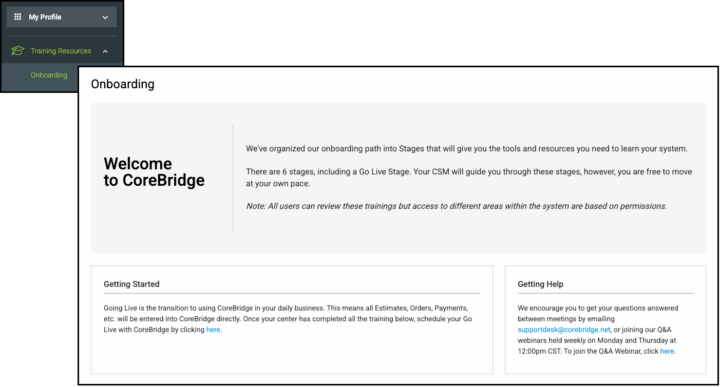 Note: These support resources are available throughout onboarding and during ongoing use of CoreBridge.
