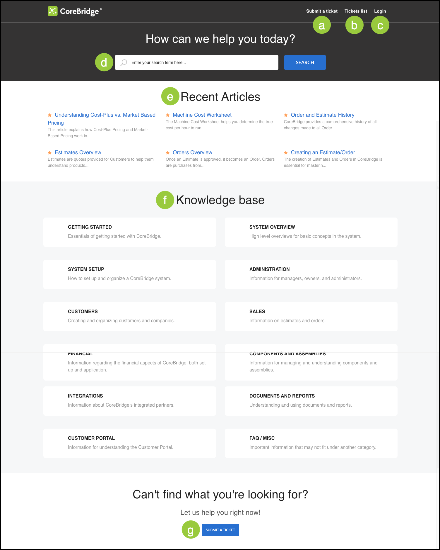 The CoreBridge Knowledge Base provides access to a wide range of articles designed to help you get the most out of your CoreBridge system. You can visit the Knowledge Base directly at supportdest.corebridge.net, or access it from within CoreBridge at any time.