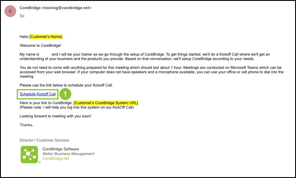 - The second email is sent by your assigned Trainer or Customer Success Manager. This message explains what has already been set up, outlines how billing works, and includes a link to the CoreBridge training scheduler.
