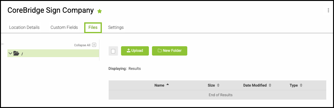 Files related to your Location can be uploaded and stored here, providing a centralized place to organize documents such as licenses, internal reference materials, or location-specific documentation.