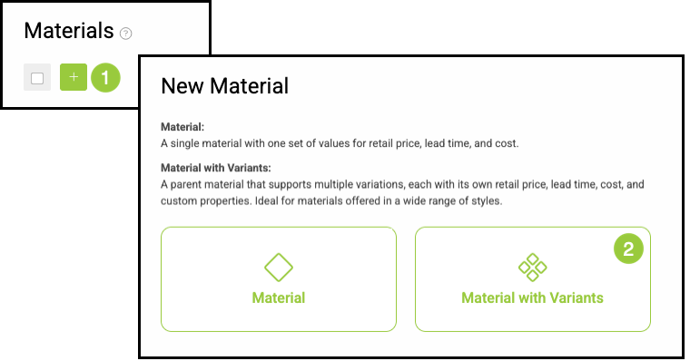 Materials are Components used to make Products. Together with Labor and Machines, they are used to create Assemblies. In some cases, a single Material may be available in multiple options, such as different sizes, colors, or finishes. Rather than creating a separate Material for each option, you can create one Material with Variants to manage those differences under a single record.