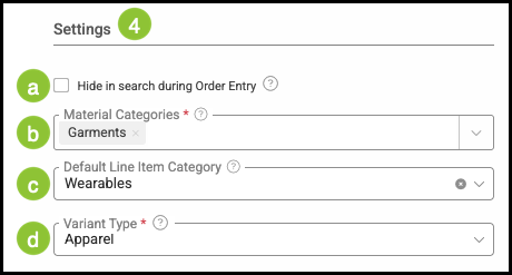 4. Enter the information about the material in the Settings section.
