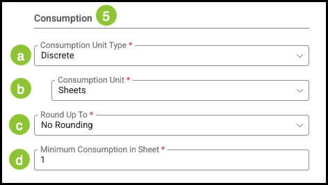 5. Consumption is how the material is consumed, rounded for usage, and scrap calculations.