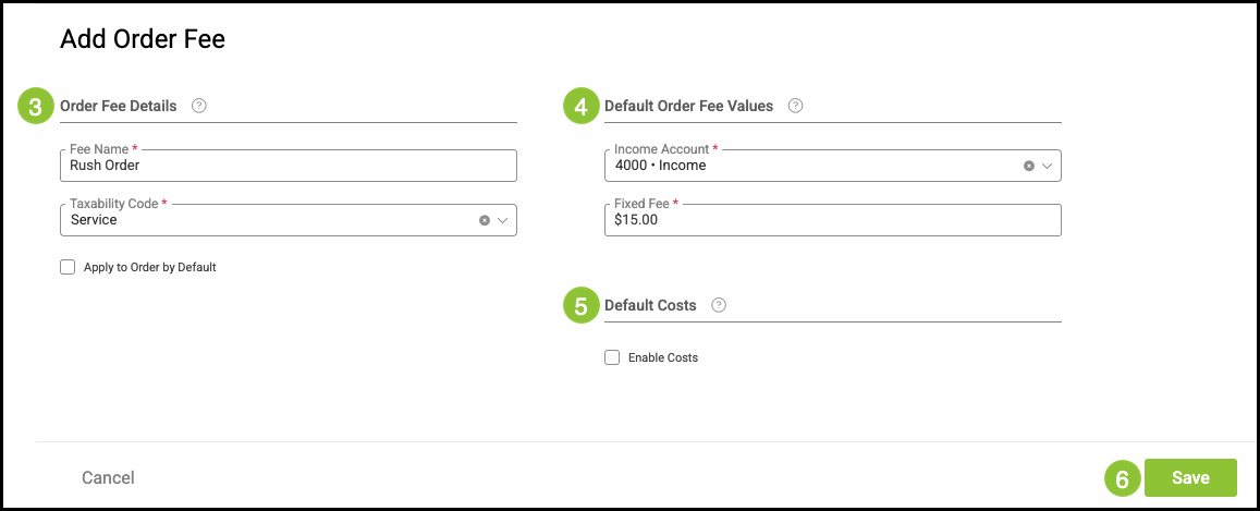 Note: The Fee Name is for internal identification and selection only. On Estimates, Orders, and other customer-facing documents, the charge will display simply as Order Fees or Line Item Fees.